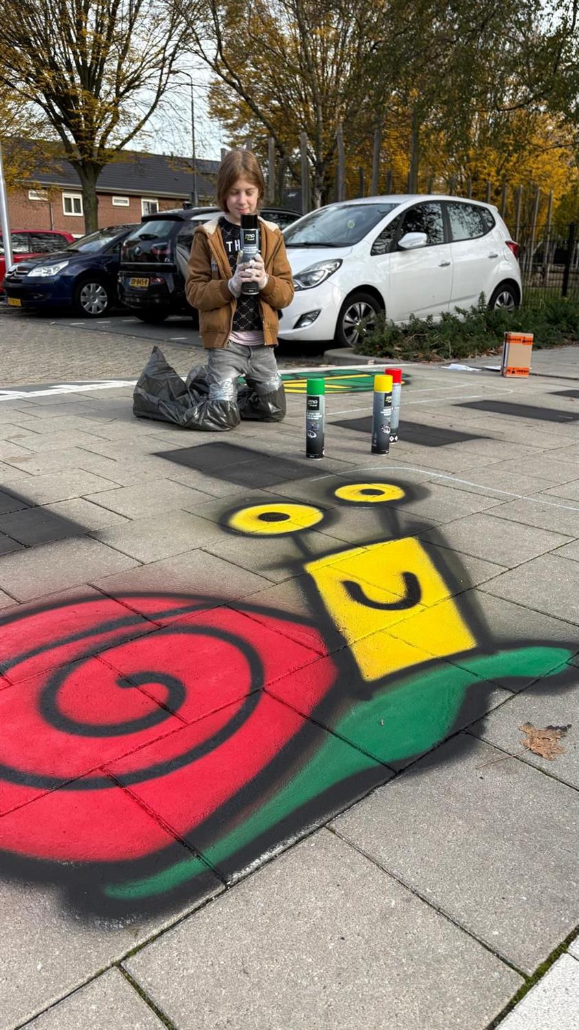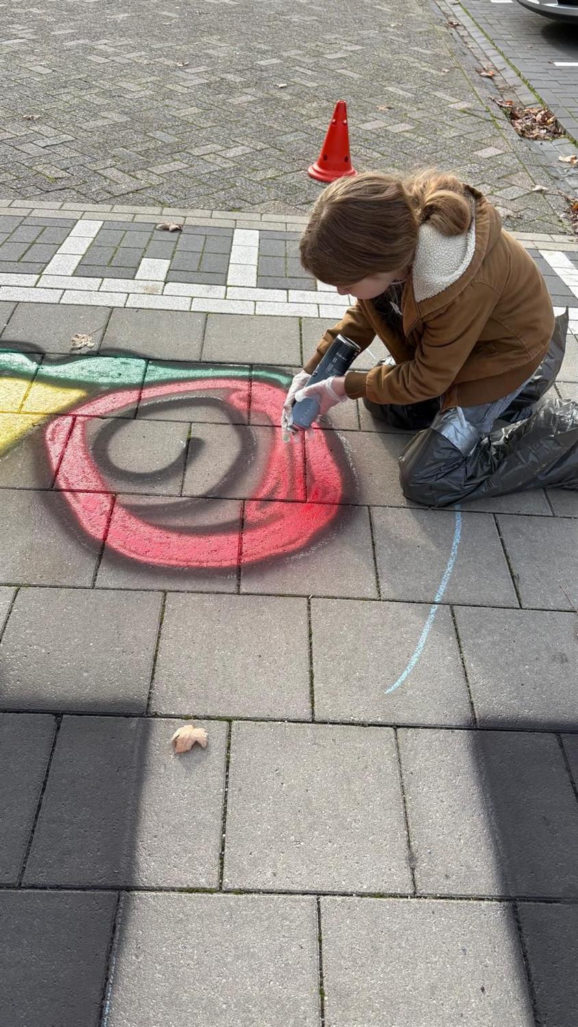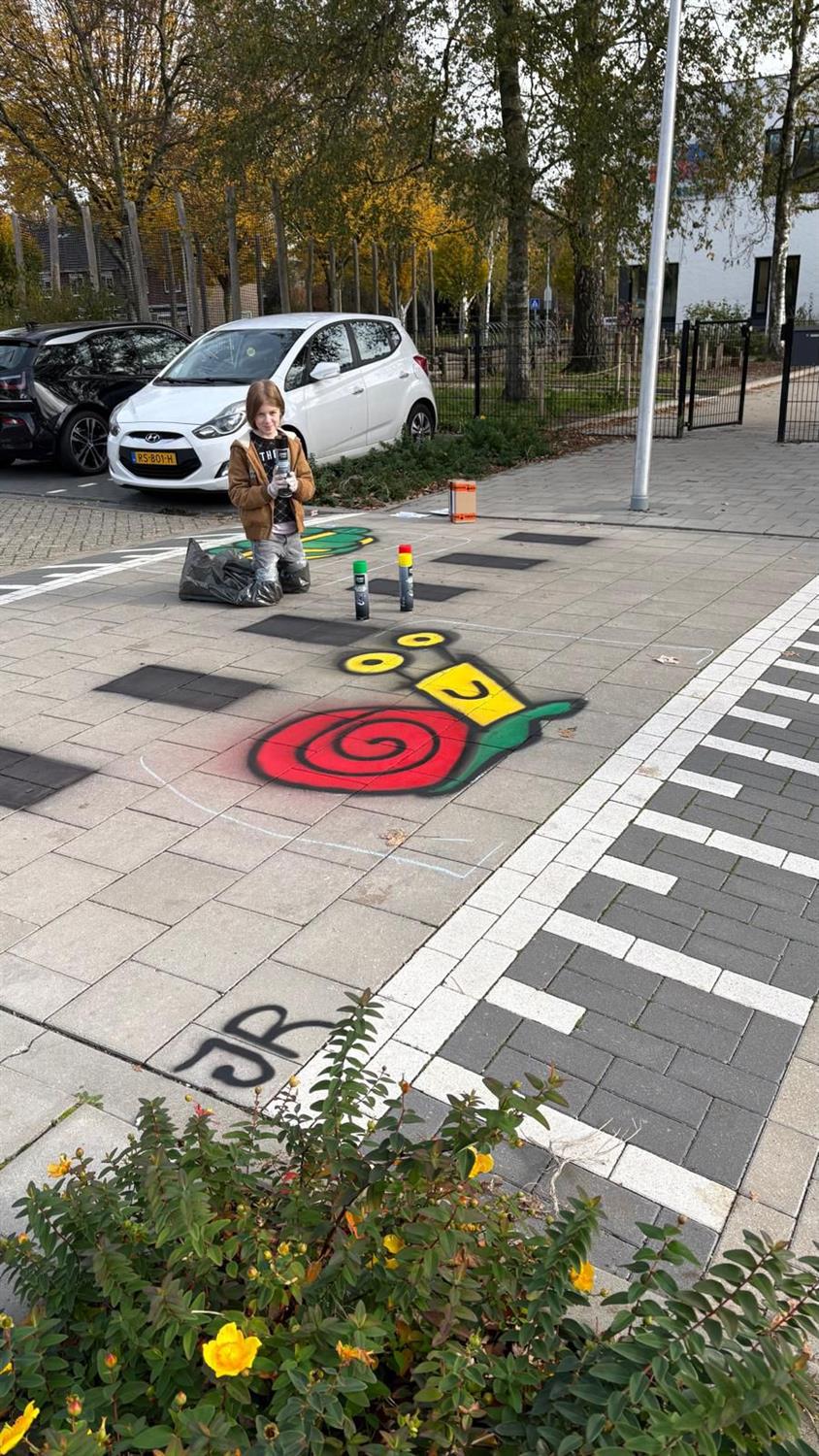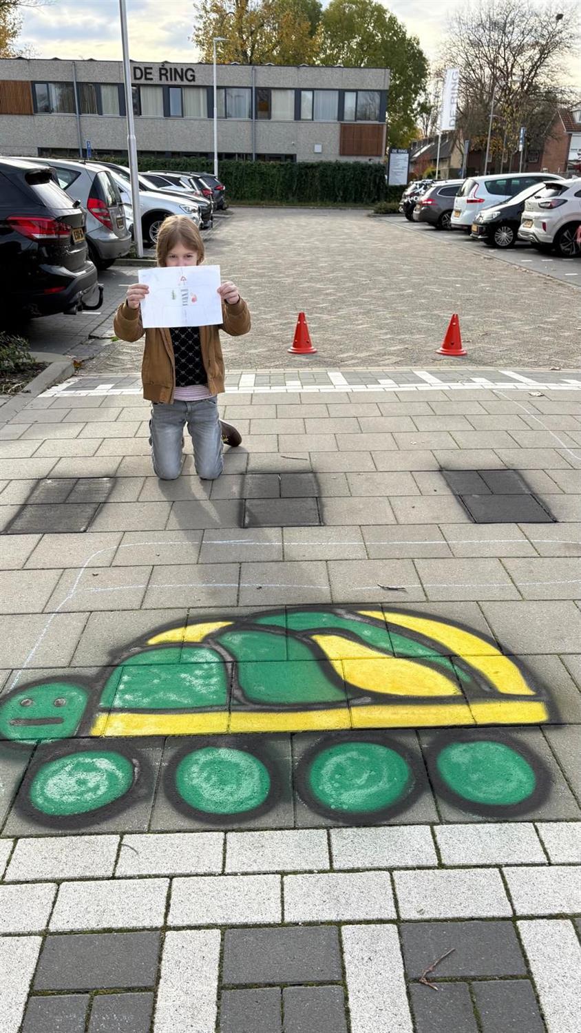 Voor de oplettende kijker heeft gezien dat sinds vorige week er een mooi ontwerp is aangebracht op de tegels van de oversteekplek voor voetgangers op de parkeerplaats. Eerder hebben we onder onze leerlingen een tekenwedstrijd gehouden waar leerlingen konden meedoen met hun ontwerp. De leerlingenraad heeft zich gebogen over de inzendingen. Uiteindelijk is er unaniem één winnaar uitgekozen: Jelle uit groep 7. Vorige week heeft Jelle samen met Meester Marc het ontwerp mogen maken op de parkeerplaats. Hieronder een aantal foto's van het mooie ontwerp: