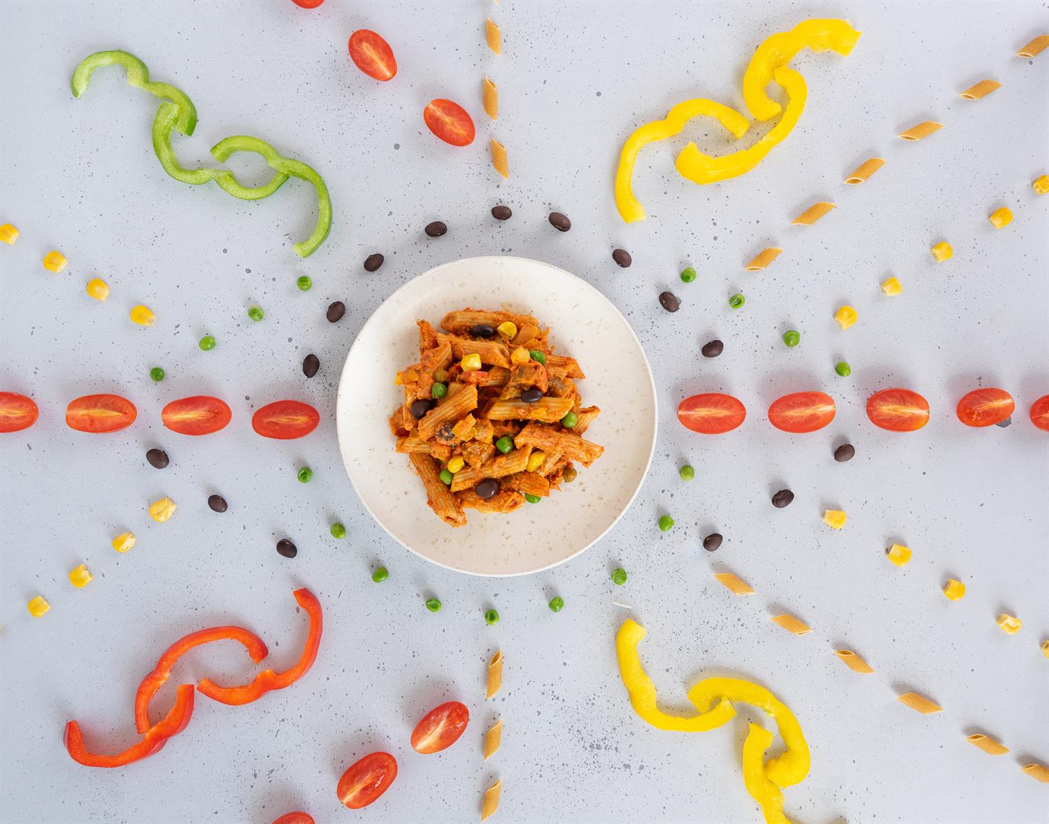 Gekookte volkoren penne (durumTARWEgries (GLUTEN), water) (27%), kookroom (kookroom (MELK (LACTOSE)), maïszetmeel), tomatenpuree (8%), maïs (7%), tomaat (7%), groene paprika (5%), ui (5%), rode paprika (5%), gele paprika (5%), doperwten (5%), water, zwarte bonen, Creme Fraiche (room (MELK (LACTOSE), zuursel), knoflook, aardappelzetmeel, raapzaadolie (1%), specerijen, zeezout, kruiden, knoflookgranulaat, zout.