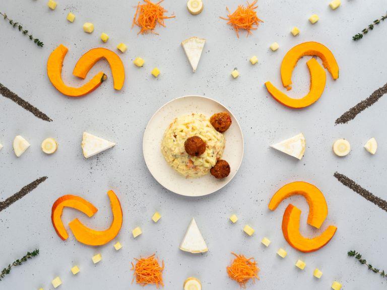 Onderbouw: Aardappel, MELK (LACTOSE), zoete aardappelballetje (zoete aardappel (2,6%), Hokkaido-pompoen (2,4%), wortel (2,4%), aardappel, emmer (TARWE (GLUTEN)), maïsgriesmeel, ui, paneermeel (TARWEmeel (GLUTEN), water, zout, gist), chiazaad, zonnebloemolie, zout, specerijen), wortel (14,3%), pastinaak (6,4%), knolSELDERIJ (6,4%), olijfolie, zonnebloemolie, zeezout, tijm.