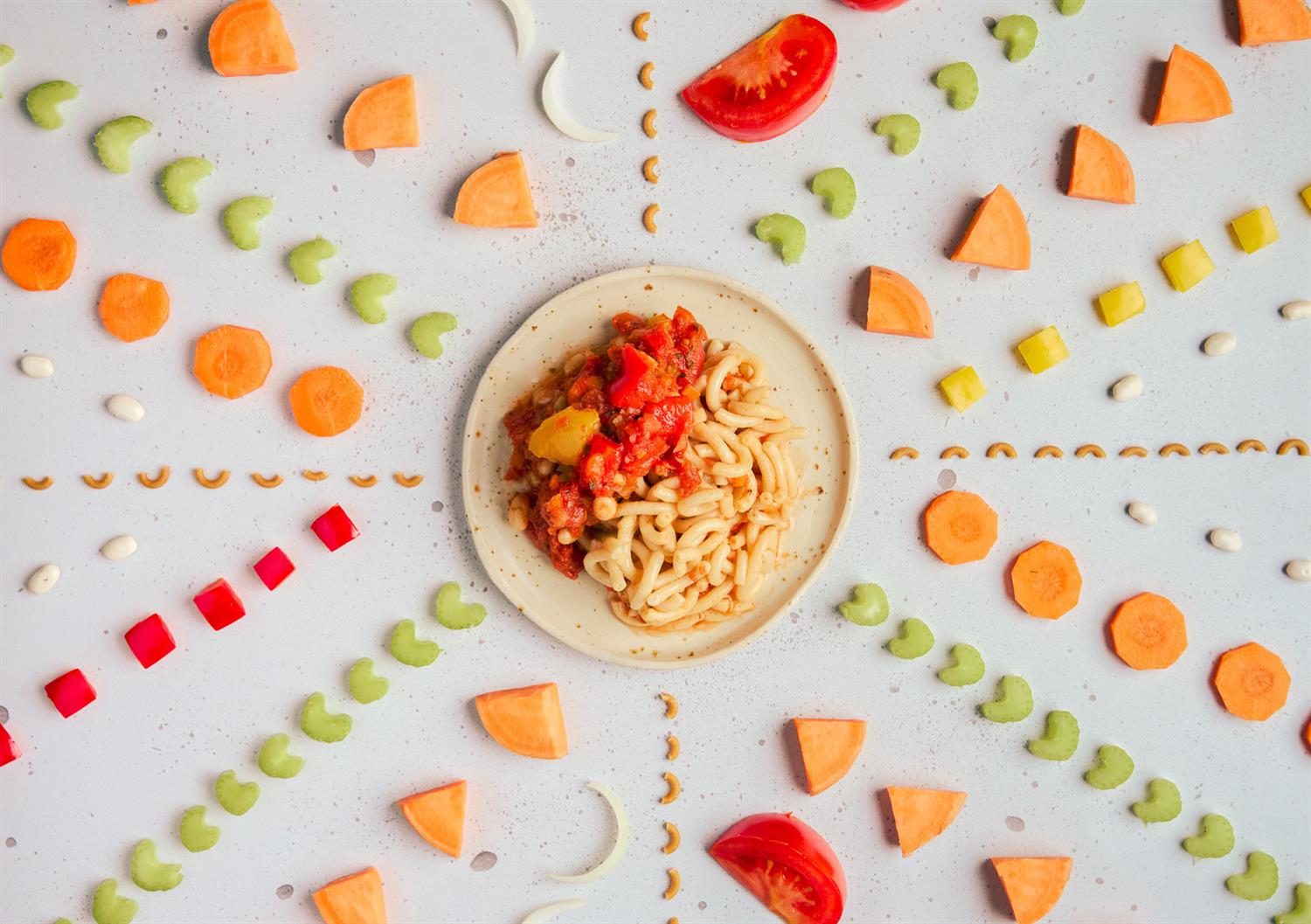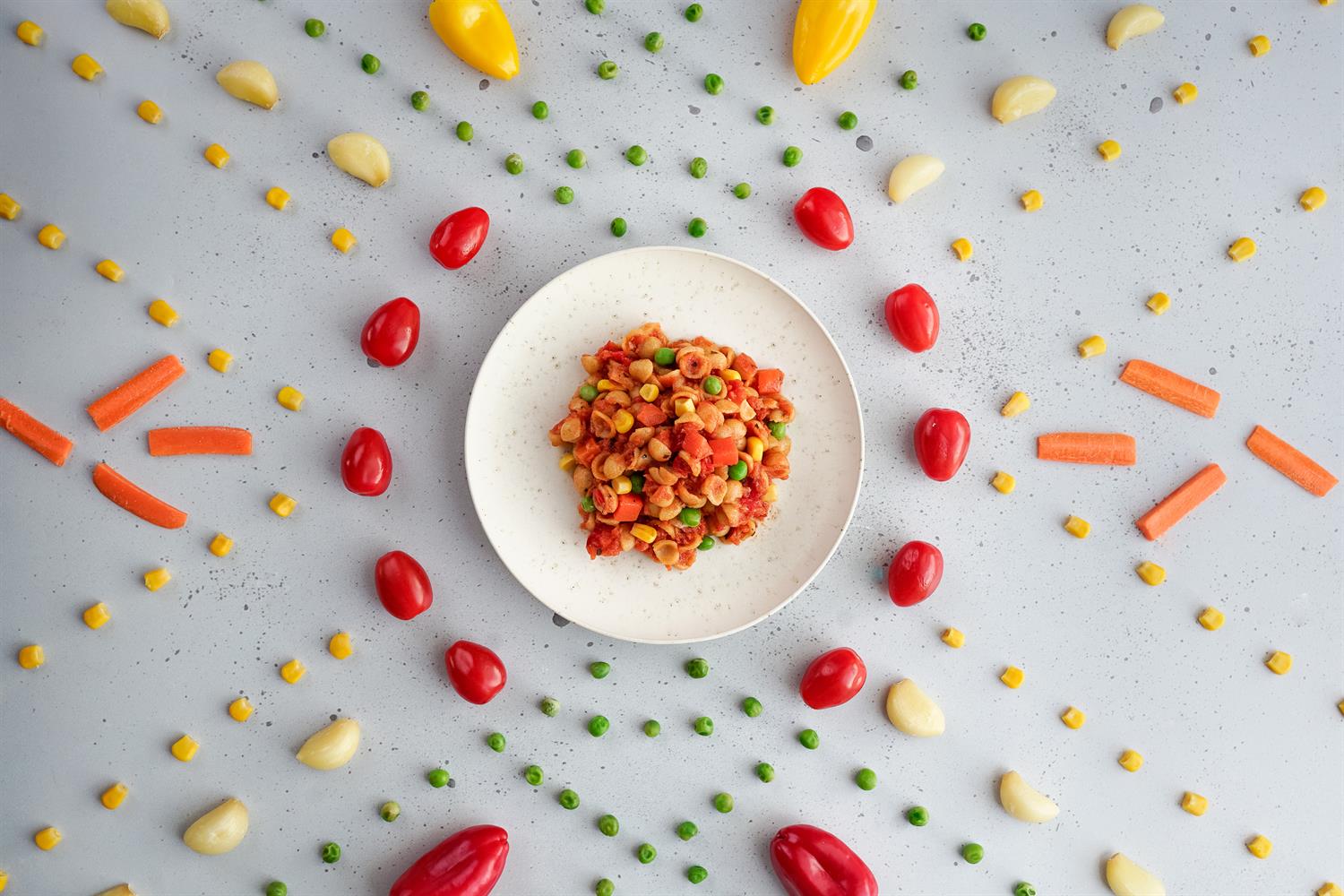 Volkoren schelpjespasta (water, volkoren durumgriesmeel (TARWE (GLUTEN)), raapzaadolie), water, wortel (11%), paprika (10%), tomatenpuree (8%), tomaat (6%), raapzaadolie, room (MELK (LACTOSE)), maïs (2%), doperwten (2%), ui (2%), tapiocazetmeel, zout, knoflook, kruiden en specerijen, voedingsgist.